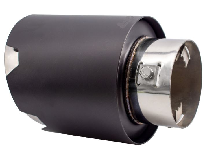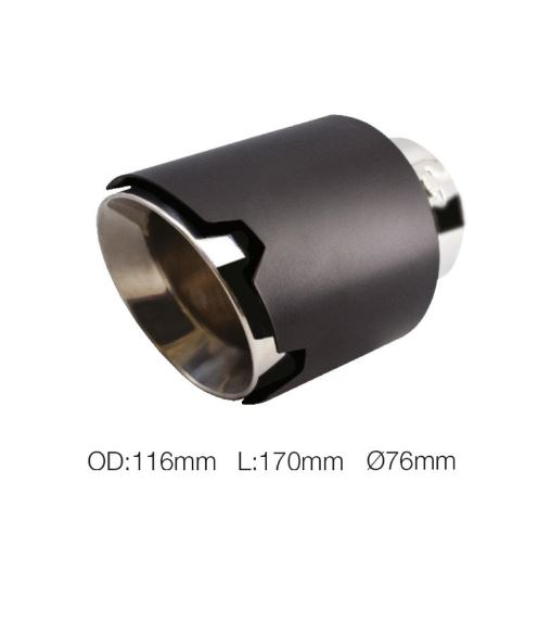 Terminale universale di scarico in acciaio inox con uscita rotonda a taglio dritto, rivestito in nero per un look sportivo e moderno. Il design con bordo sagomato e uscita maggiorata da 116 mm valorizza il posteriore dell’auto senza intervenire in modo invasivo sullo scarico originale. Si monta sul terminale esistente grazie al pratico fissaggio con bulloni, senza bisogno di saldature.